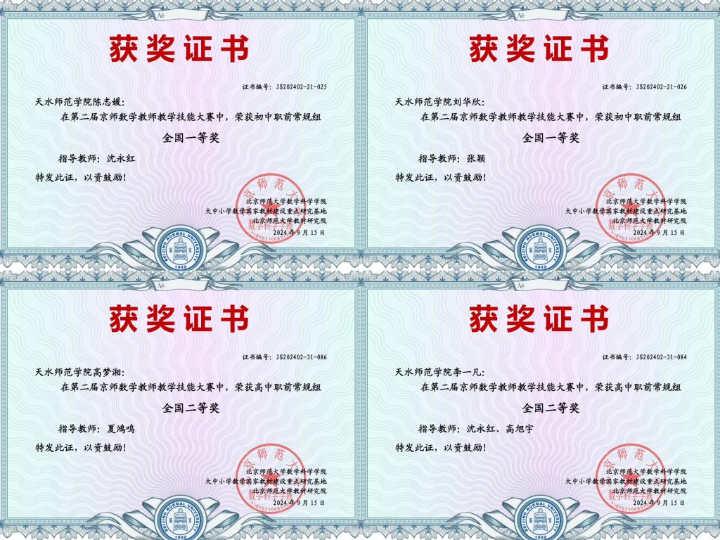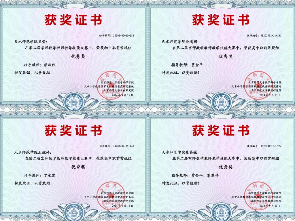 近日,第二届京师数学教师教学技能大赛结果揭晓,beat365英国官方网站学生在比赛中取得优异成绩,获教学技能大赛常规组全国一等奖3项、二等奖2项、优秀奖6项,特色组全国一等奖1项;天水师范学院获最佳组织奖。
