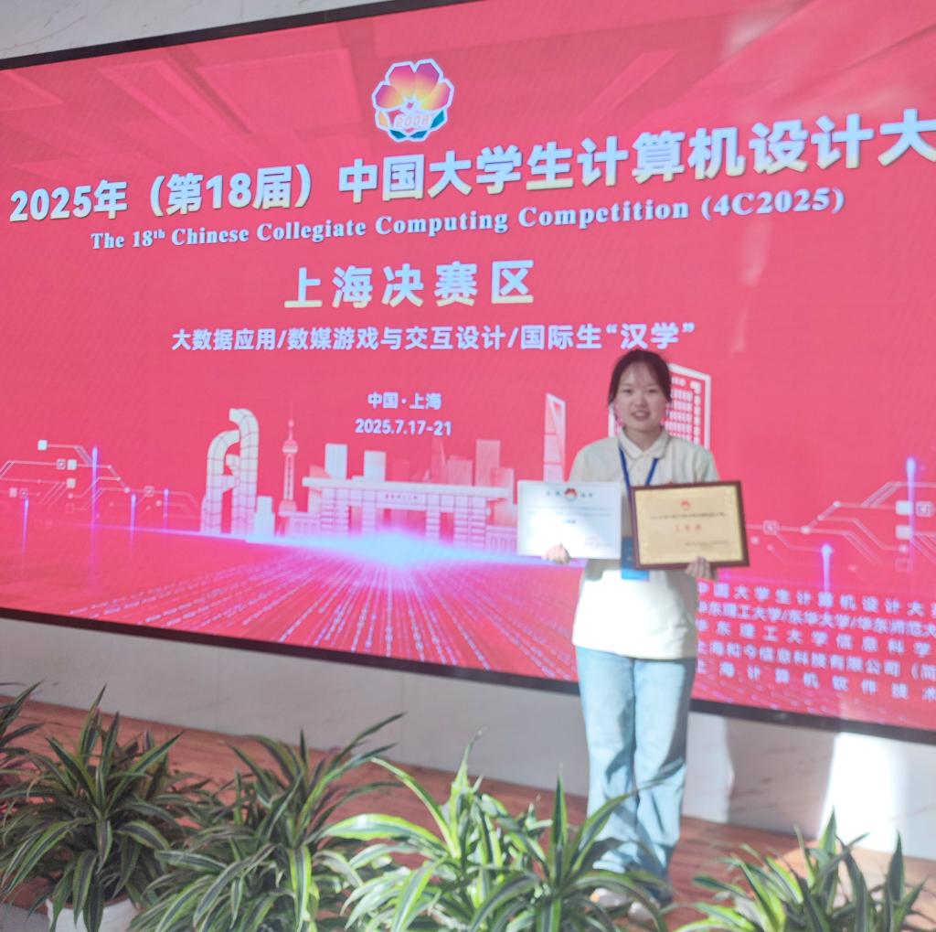 7月21日,2025年(第18届)中国大学生计算机设计大赛全国总决赛在上海华东理工大学圆满举行,本次赛事吸引全国500余支队伍同台竞技,经过紧张激烈的角逐,beat365英国官方网站刘倩茹和机电与汽车工程学院林欣2名同学组成的团队,凭借作品《数览天水—大数据驱动的古城沉浸式导览系统》脱颖而出。在决赛现场,刘倩茹同学代表团队进行项目路演与答辩,通过出色的视觉呈现、清晰的方案阐述与自信的答辩互动,全面展示了该作品的创新价值与社会效益,在大数据应用赛道中荣获全国三等奖。