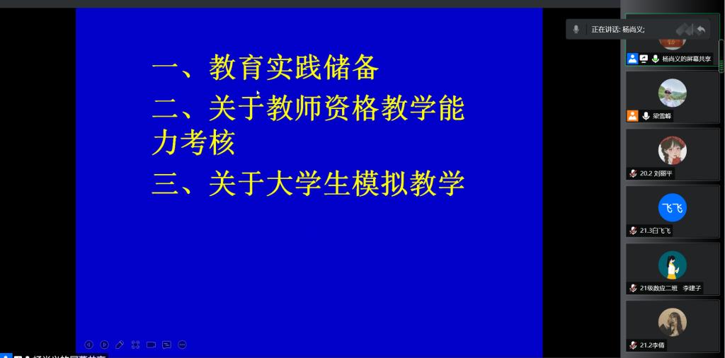 7月8日晚7:30,应beat365英国官方网站邀请,天水市逸夫实验中学杨尚义老师通过腾讯会议在线作了题为《拿什么献给你,教师生活—谈大学生教育实践应具有哪些基本的储备》的专题报告,学院部分教师、数学与应用数学专业20级、21级学生共300余人参加。
