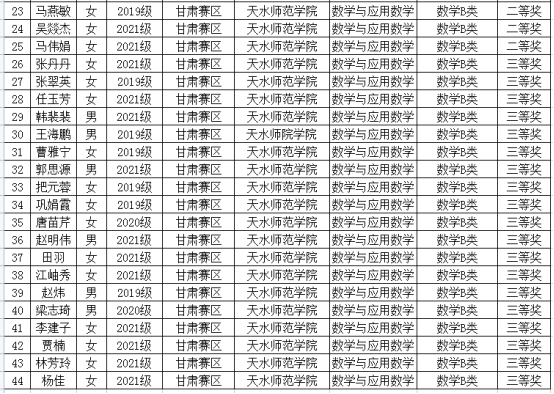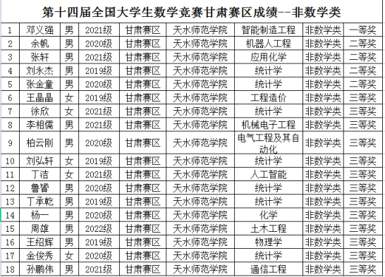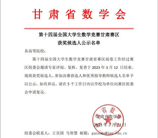 由中国数学会主办的2023年第十四届全国大学生数学竞赛(甘肃赛区)获奖名单近日揭晓。beat365有62名同学喜获佳绩。数学专业B组获奖44项,其中一等奖6项,二等奖19项,三等奖19项;非数学专业获一等奖1项,二等奖4项,三等奖13项,共18项。数统学院2019级学生钱崇姣获数学专业B组第三名,机电学院2021级学生邓义强获非数学专业第7名,两人将代表甘肃赛区参加全国大学生数学竞赛决赛。